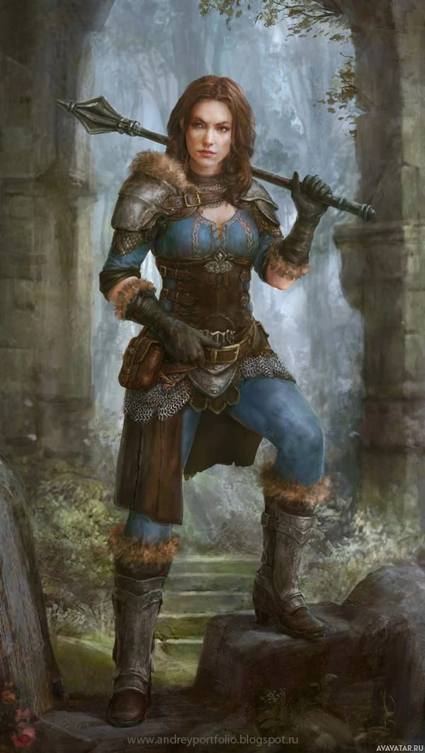 a female warrior, characterized by her attire and the weapon she is holding. She appears to be in