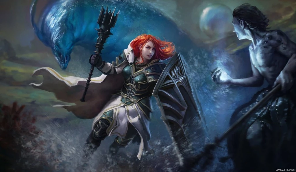The image features a female warrior with