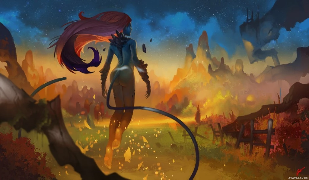 a fantasy scene. A character from behind is shown, with a red or orange hair color and what appears to be a tail in a non-traditional form—it could either be an animal's tail or some kind of