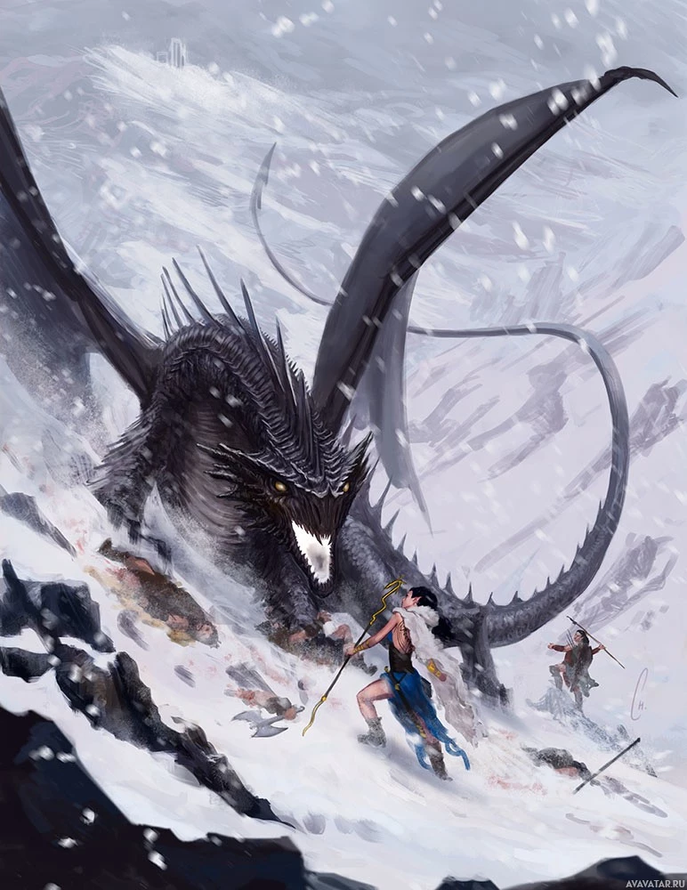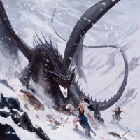 a fantasy scene with a dragon and several figures. There are two human-like characters who appear to be in combat or confrontation with the dragon, which is illustrated as a large, menacing creature with