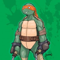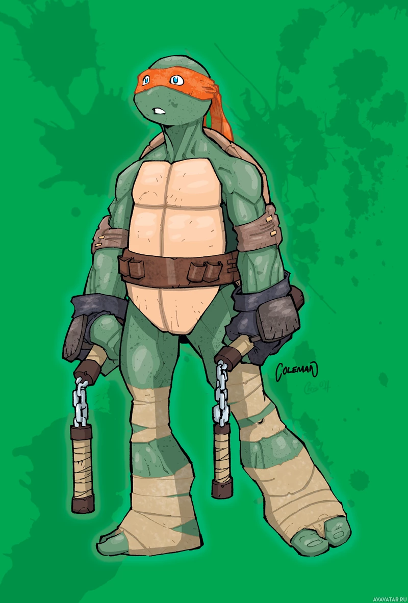 На картинке изображен Микеланджело, одна из черепах-ниндзя-подростков. Он изображен в своем фирменном зеленом наряде с коричневым поясом, держащим пару нунчаков и имеющим повязки на коленях и локтях.