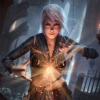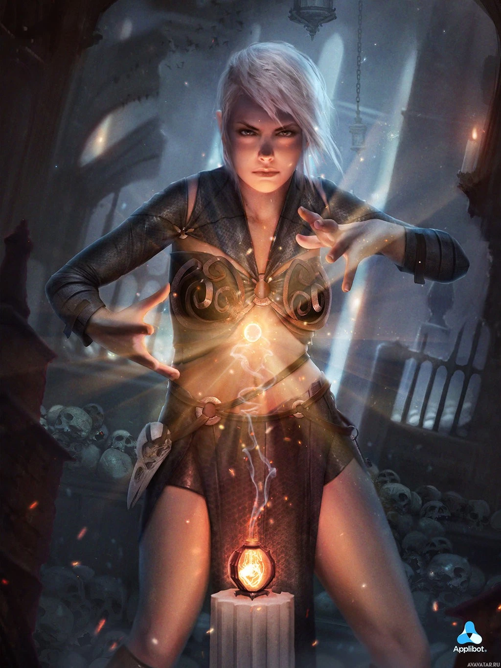 sort of magic. The setting looks like a dimly lit room or crypt, which adds to