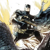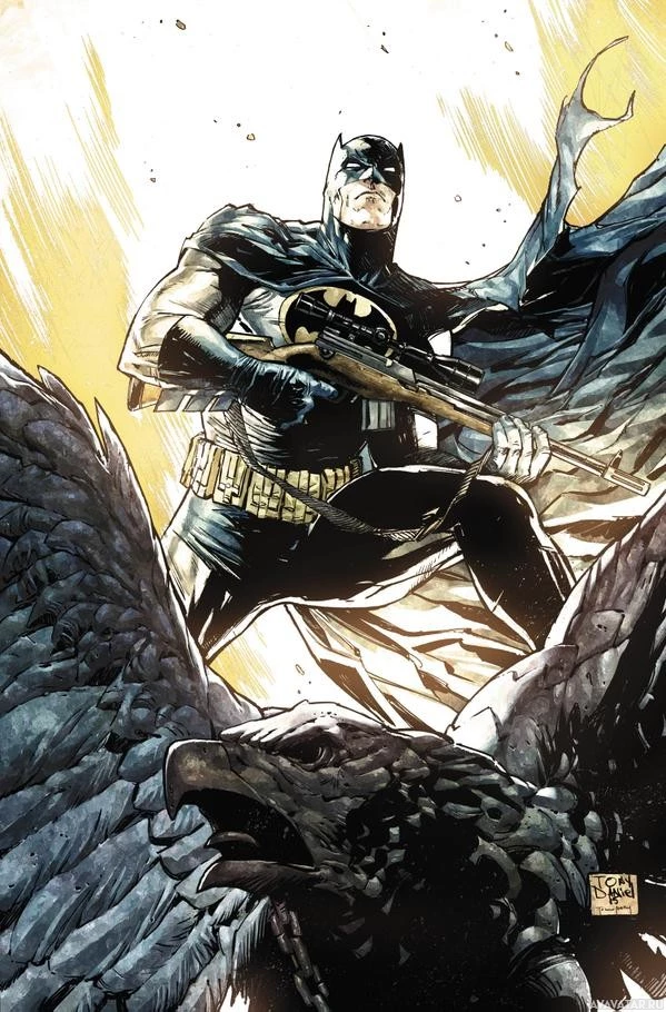 traditional costume with a bat emblem on his chest and cape, holding what appears to be a batarang (a weapon used by Batman). In this particular panel, Batman is shown against