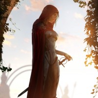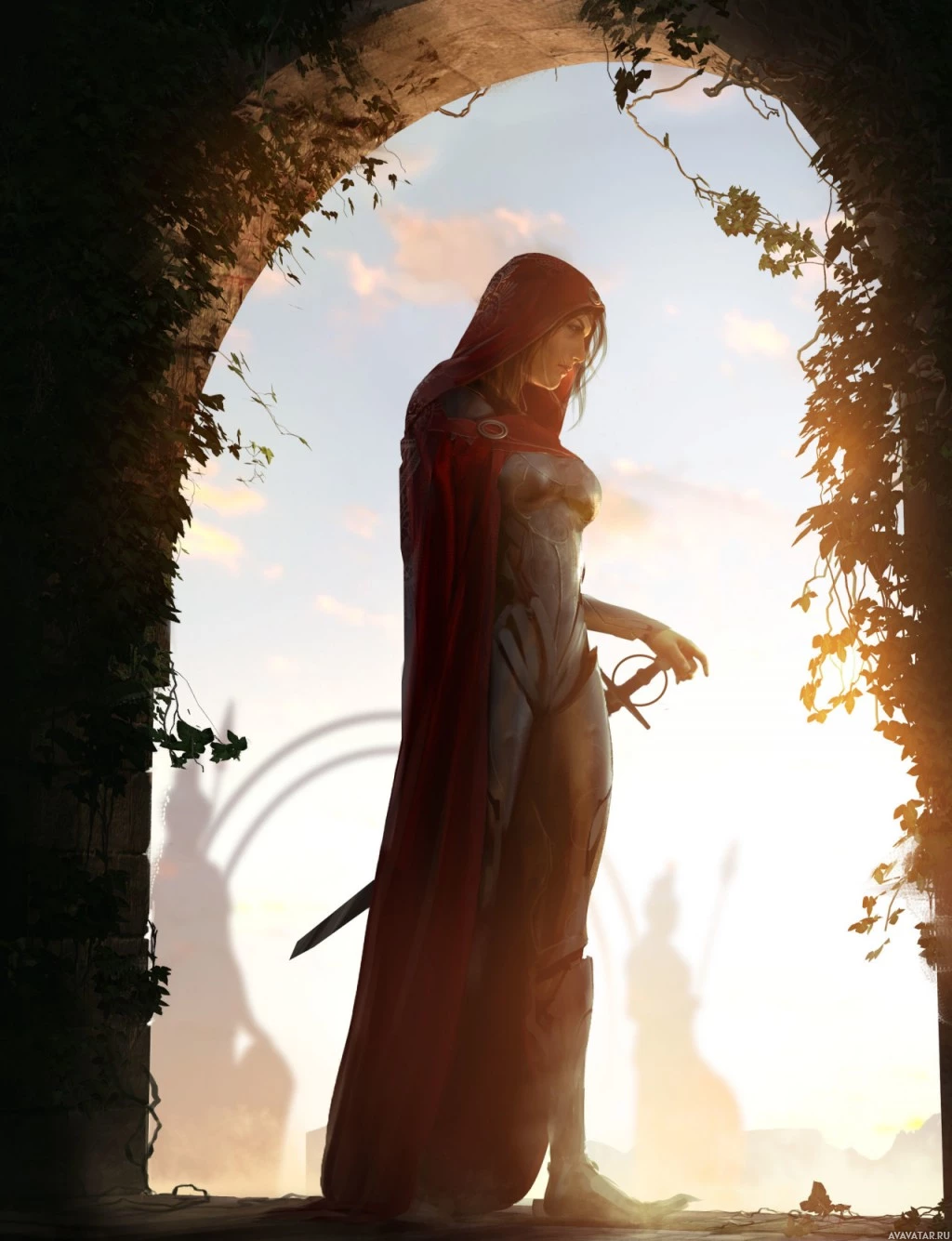 a female character standing in front of an archway with vines growing over it. She is dressed in what appears to be fantasy-themed armor, suggesting she might be a warrior or a guardian type character from