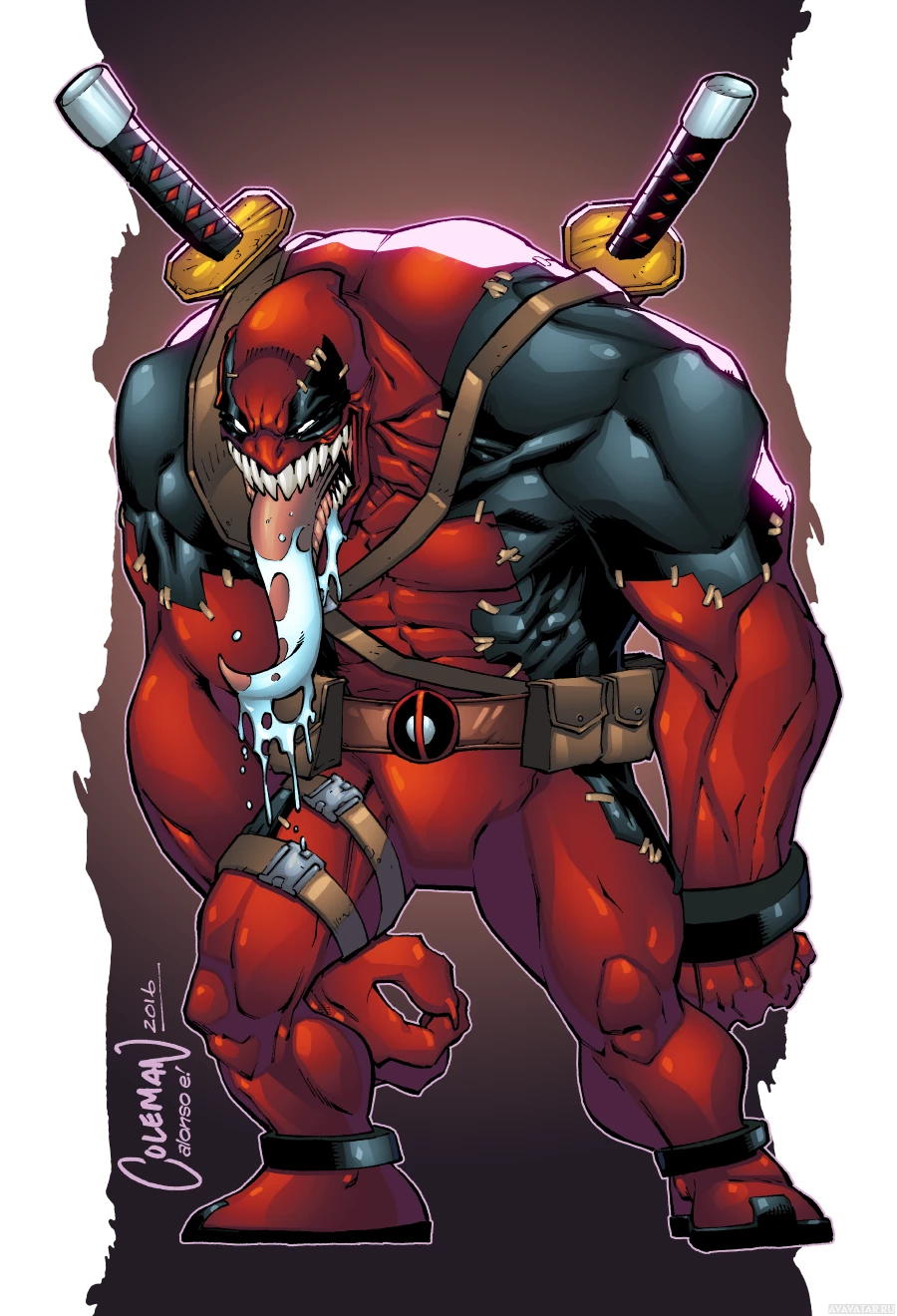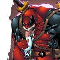 This image features a stylized and exaggerated character that appears to be a fusion of the iconic characters Venom and Deadpool. The character is depicted with spiky, aggressive-looking teeth and is wearing a black muscular