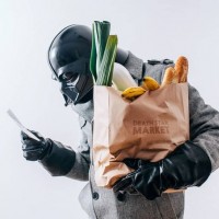 the Star Wars franchise, holding a bag of food items. Inside the bag, you can see various pieces of produce such as broccoli and carrots, along with what appears to be bananas and possibly some other fruits or vegetables. It seems like a creative juxtaposition of a well-known villain from