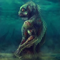 the body of a fish with scales, fins, and a tail, but it also possesses human-like features, such as arms and a torso, giving it an anthropomorphic appearance. The creature is standing upright in what appears to be a murky