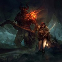 the demonic figure, possibly preparing for combat or negotiations. The setting appears to be outdoors, and the ground is covered with debris that suggests recent conflict or a disaster of some sort. The overall atmosphere of the image is intense and dramatic, typical of fantasy artwork where epic battles are often portrayed.