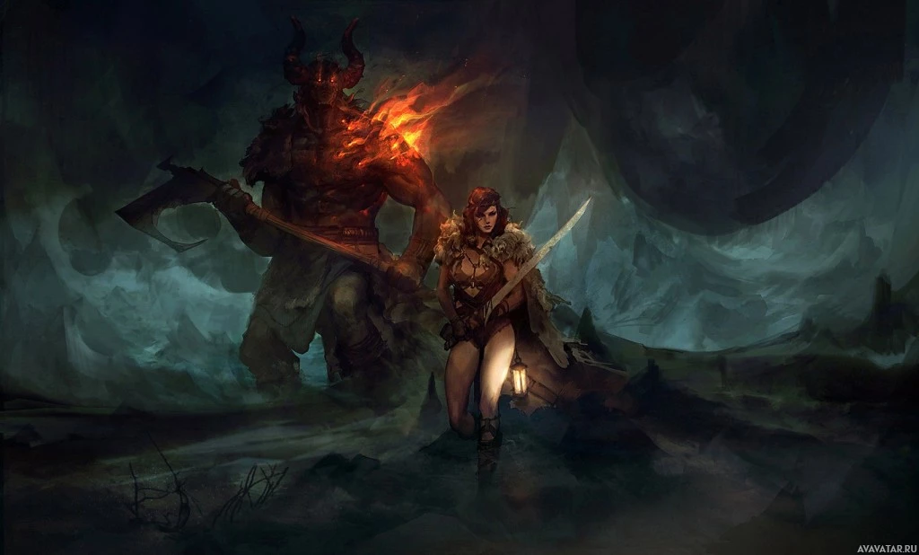 a demonic entity with horns and a tail, wielding a large sword. This character is likely meant to represent
