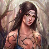 dark hair with some strands flowing behind her ear, and her facial expression is serious or intense. Her eyes are sharp and focused, and she wears a headband that appears to be made from what could be bone or another material. The character is adorned with tribal-like body paint or tattoos on her shoulders and chest, which adds to