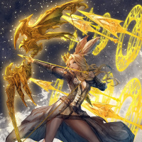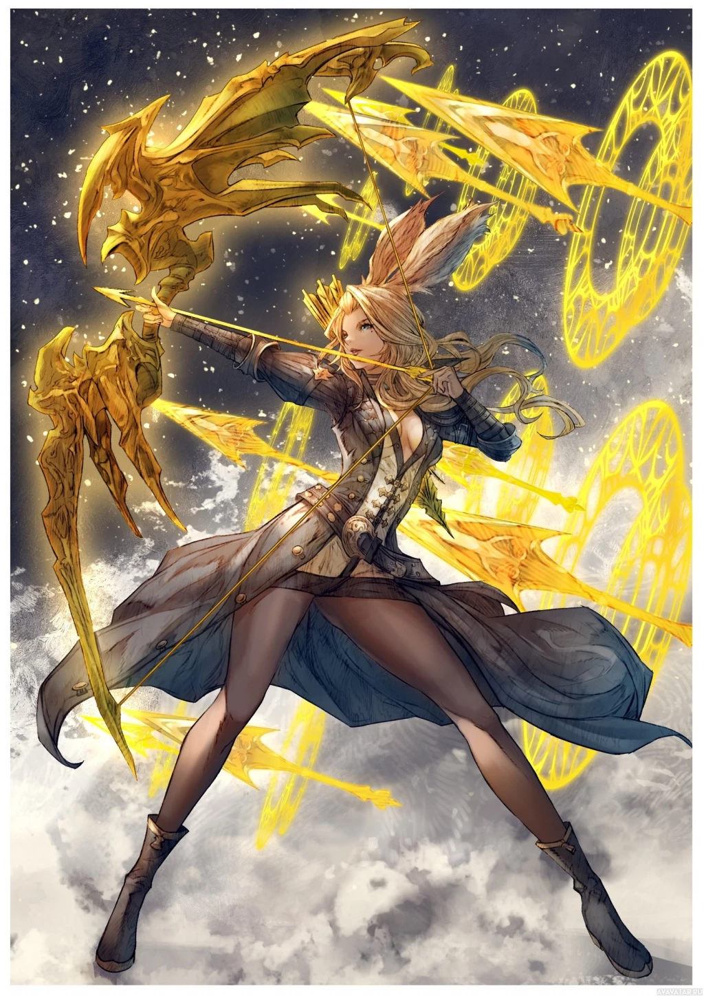 a fantasy character wielding a golden bow. She is standing on what appears to be clouds or some form of ethereal platform, as suggested by the background elements that look like stars and