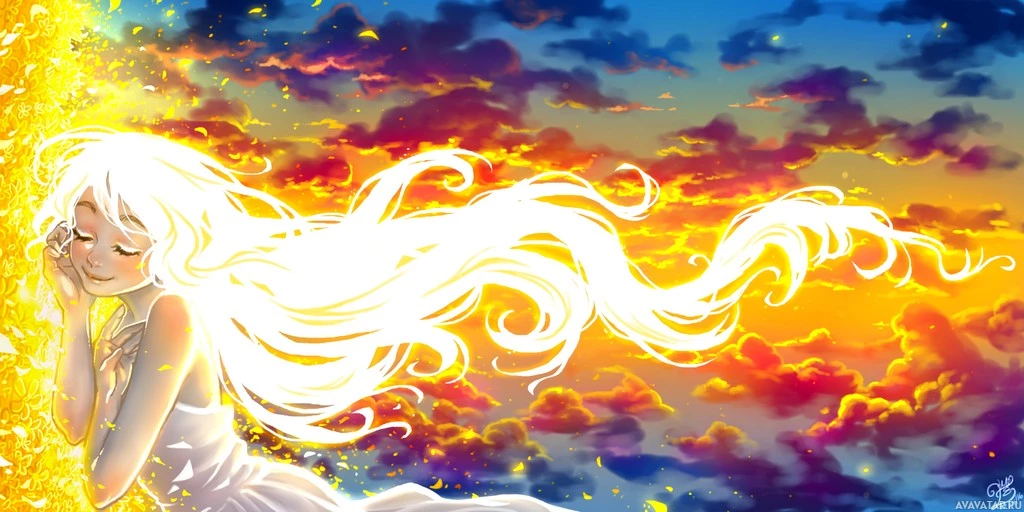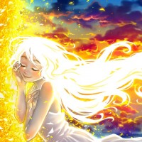 warm colors such as orange, red, and yellow dominating the scene. There are also small sparkles of light around her, adding to