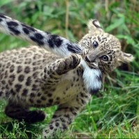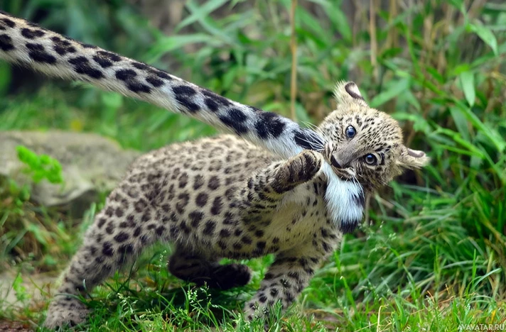 natural habitat, possibly a grassy area with some vegetation. The cub is running and seems to have caught something small, which it's holding between its mouth. Its tail is raised high, indicating motion or excitement. Leopards are known for their distinctive spotted