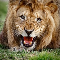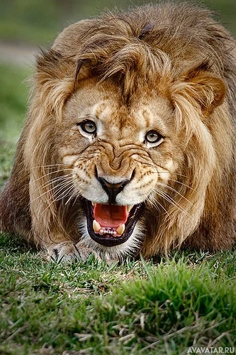 The image shows a lion lying on grass, with its mouth wide open as if it's roaring or growling. Its fur looks dense and well-groomed, indicative of