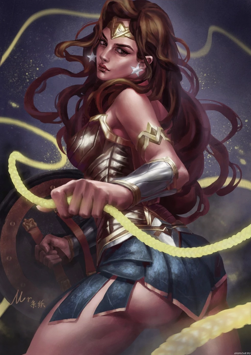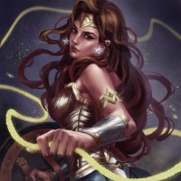 a dynamic pose with her right arm raised, holding the Lasso of Truth and her left hand gripping a sword. Her hair is flowing behind her, adding to