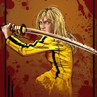 comic book. She is depicted wielding a sword, suggesting she may be a warrior or fighter of some kind. The setting appears to be a battlefield with blood splattered on the ground around her feet, indicating that there has been violence or conflict in this scene. Her attire and style suggest she might be part of an action-