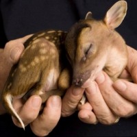 The image features a small fawn, which is an animal known for its spotted coat, being held gently in someone's hands. It appears to be resting peacefully. There are no deer present; the fawn is likely what the person holding it intended.