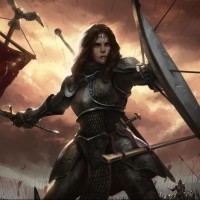 a female warrior in battle armor, holding a sword and shield. She is standing in front of what appears to be