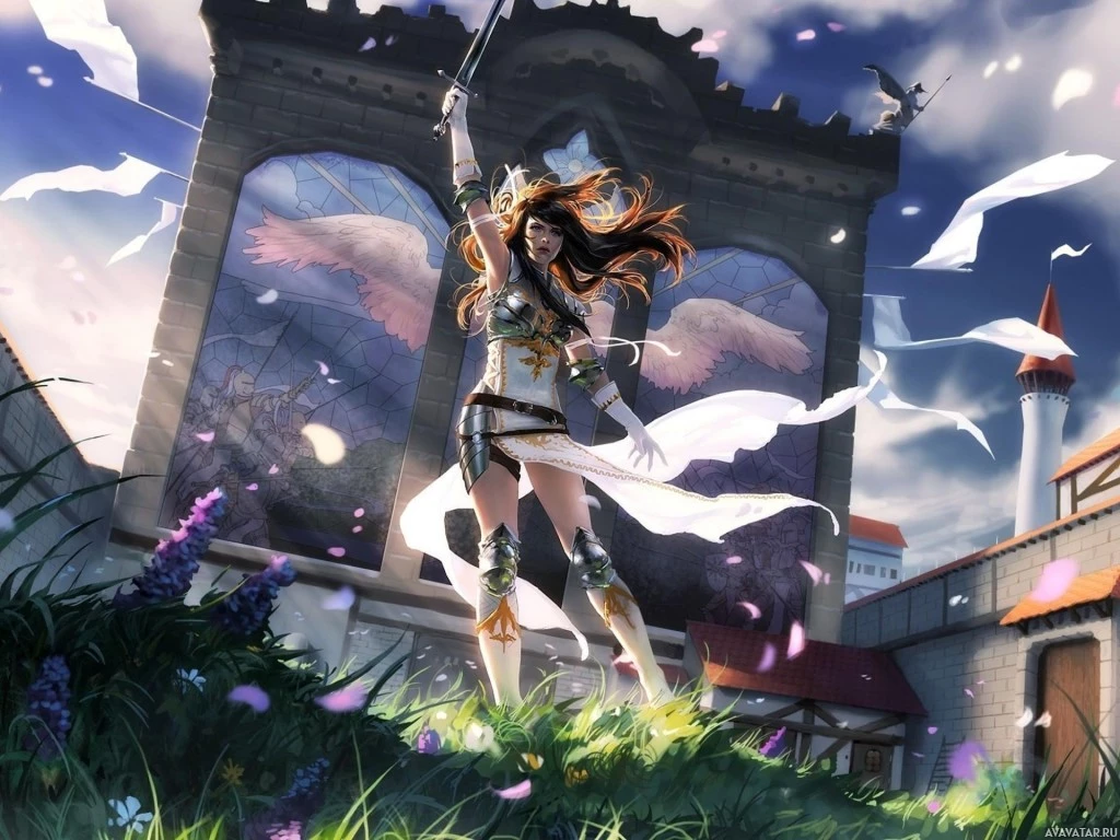 a female character dressed in fantasy-style armor. She has long brown hair and appears to be holding a sword in her right hand while striking