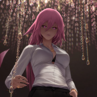 pink hair and what appears to be a fox-like tail. She is dressed in a sleek