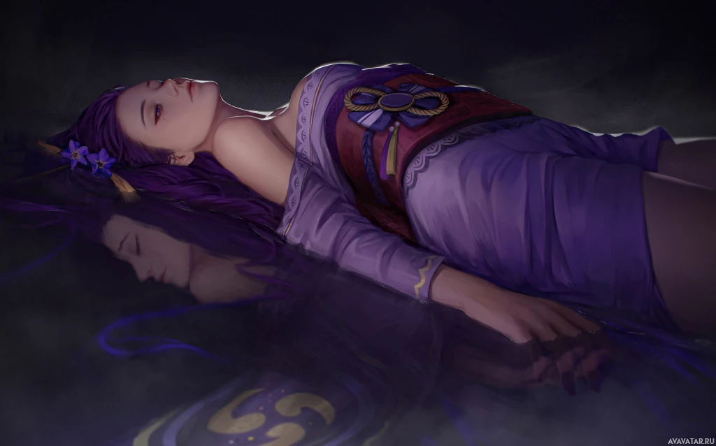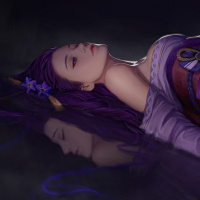 purple hair and is wearing what appears to be an ethereal, fantasy-style outfit that incorporates shades of purple and blue. The character's pose is relaxed, with one hand resting gently on the ground while the other arm is raised behind her head, suggesting