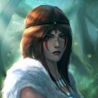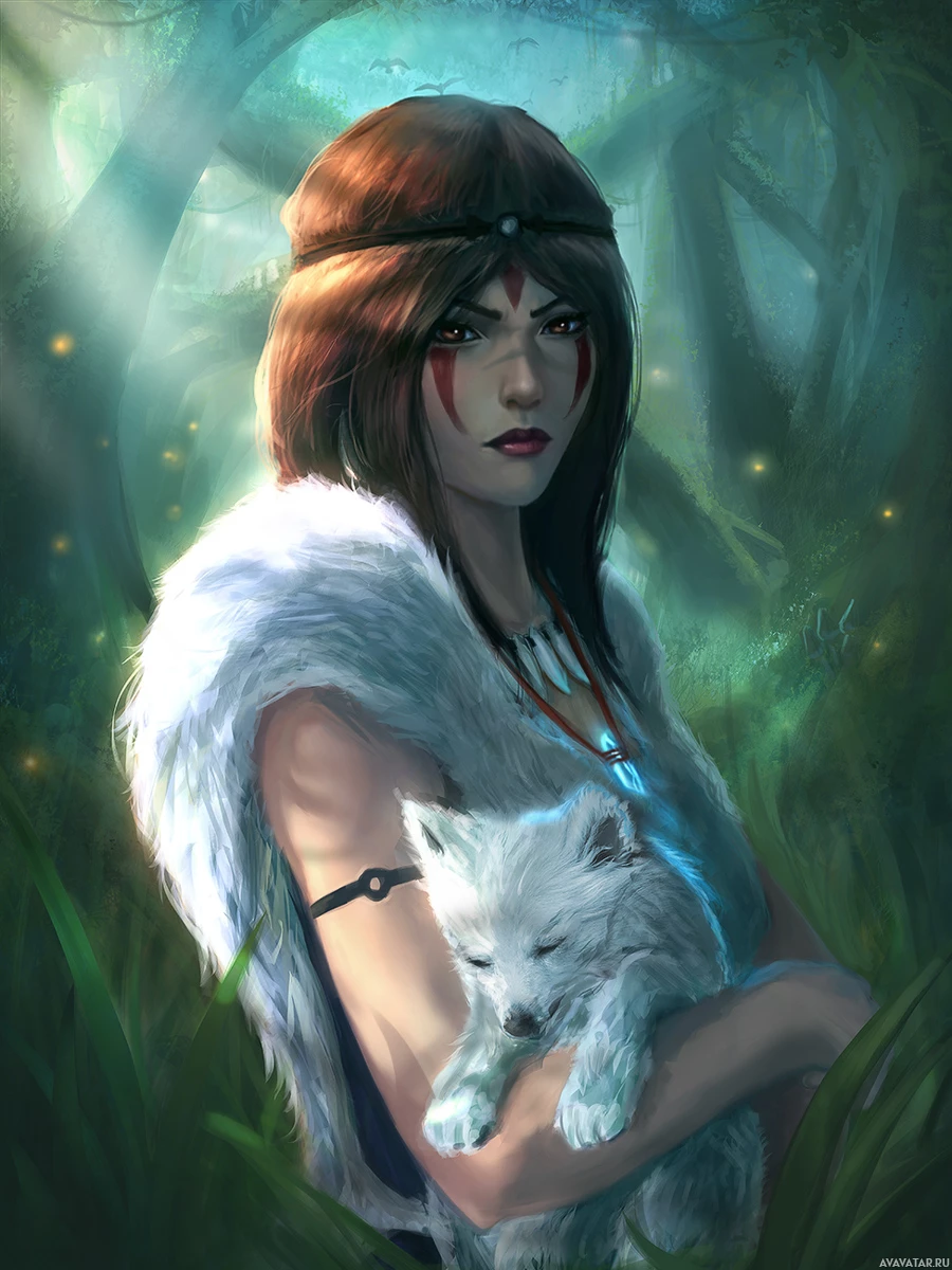 a fur garment that suggests a cold environment setting. Her expression is serious and she seems to be gazing off into the distance. In her arms, she holds a small wolf-like creature which could possibly be
