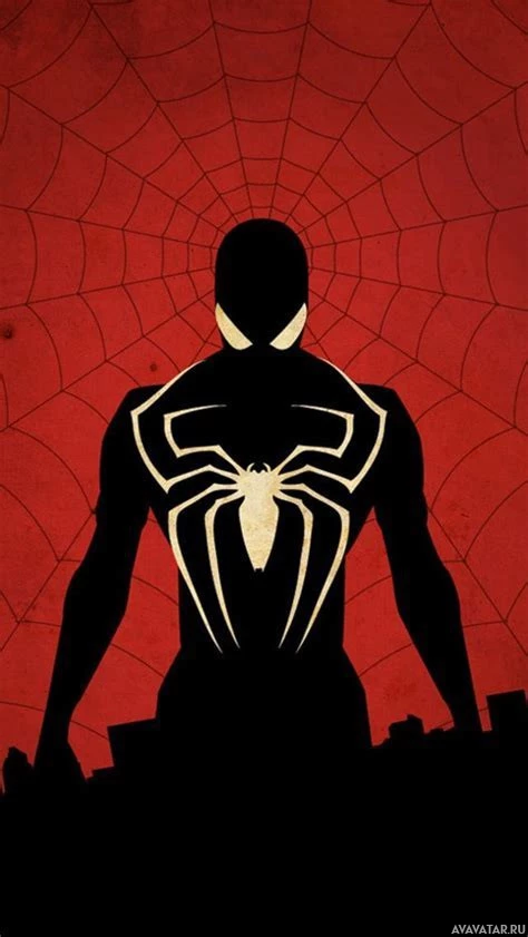 a red background, which includes a spider web design and a city skyline silhouette. This artwork is typically associated with the fictional superhero created by writer Stan Lee and artist Steve Ditko, who first appeared in