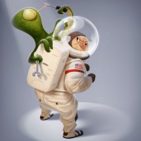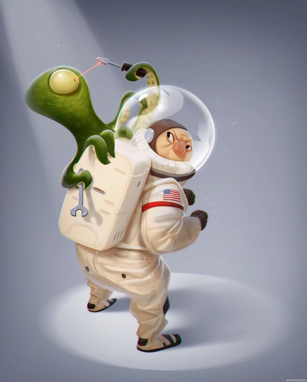 a space suit with a helmet and American flag patch, accompanied by a green alien character. The astronaut is holding a futuristic-