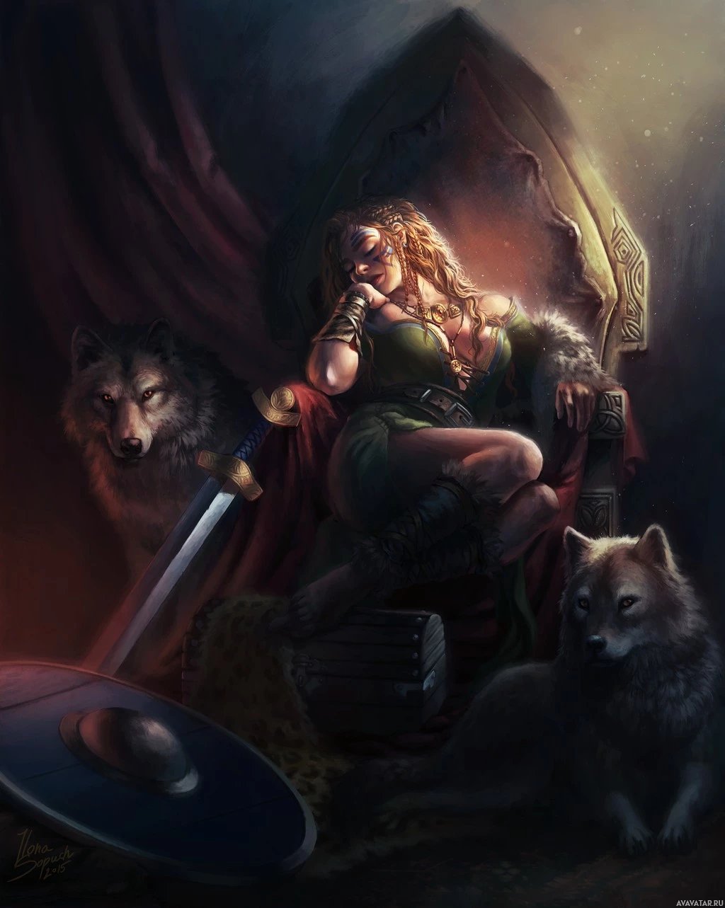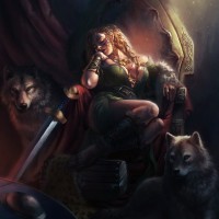 На картинке изображена фантастическая сцена с девушкой, сидящей на животном троне. Она держит меч, и вокруг нее волки. Сеттинг имеет темную атмосферу, возможно, указывающую на замок или мистический лес. Одежда девушки предполагает, что она может быть воином или принцессой из мира фантазий.