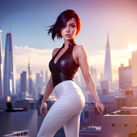 a female character standing on what appears to be the edge of a high platform in an urban environment. She has short