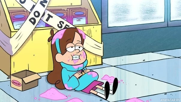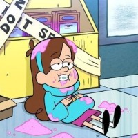 an animated character who appears to be Mabel Pine from the "Gravity Falls" television series. She is sitting on a box with