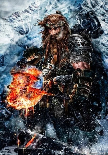 a long beard and mustache, wearing armor and holding what appears to be a magical hammer that emits sparks or flames. The setting suggests a cold, icy environment, possibly a mountainous area or an underground location associated with