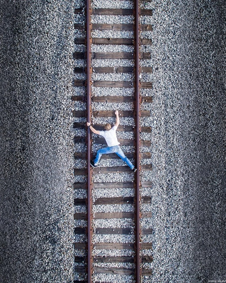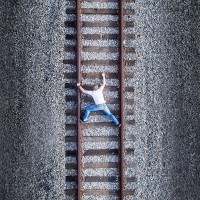 railway tracks. The individual's arms and legs are spread out in an attempt to balance themselves as if they were walking along or sliding down the tracks. There is gravel between the wooden rails of the track. The setting suggests this might be a humorous or daring moment captured for artistic, entertainment, or journalism purposes.