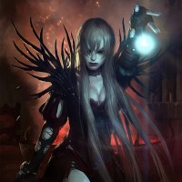 black hair with white streaks, and she's wearing a dark robe with intricate detailing that suggests a magical or occult theme. In her right hand, she holds a transparent,