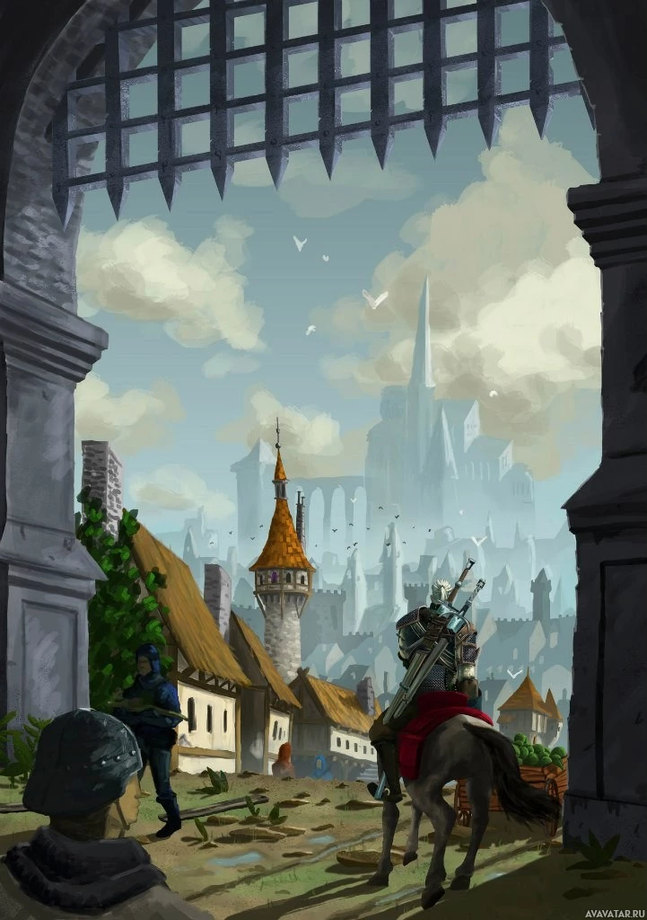 a fantasy scene. In the foreground, there is an arched doorway or portal leading to