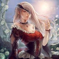 The image shows a fantasy-style illustration of a girl with blonde hair and light eyes. She is wearing a costume that appears to be inspired by medieval or historical fashion, featuring elements such as lace, ruffles, and a cape. Her expression is calm and contemplative as she gazes off to the side. The background suggests