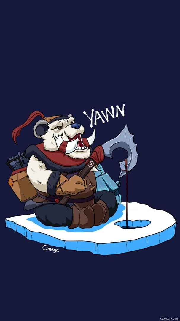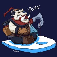 a small platform with blue ice-like elements surrounding it, giving the impression he's sitting on an iceberg or similar structure. The artwork is detailed and colorful, reflecting the character's design in the game.