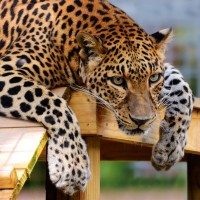 The image features a leopard leaning over a wooden structure. The leopard appears to be looking directly at the camera with its gaze focused and somewhat intense. It is an adult animal with distinctive spotted fur that covers its body, including its long tail. The background suggests an outdoor setting with natural lighting.