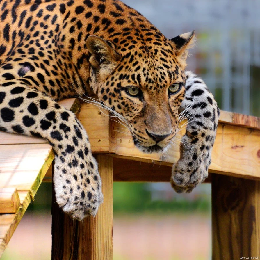 На картинке изображен леопард, наклонившийся над деревянным сооружением. Леопард, кажется, смотрит прямо в камеру с сосредоточенным взглядом и несколько напряженным. Это взрослое животное с характерным пятнистым мехом, который покрывает его тело, включая длинный хвост. Фон предполагает наружную обстановку с естественным освещением.