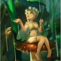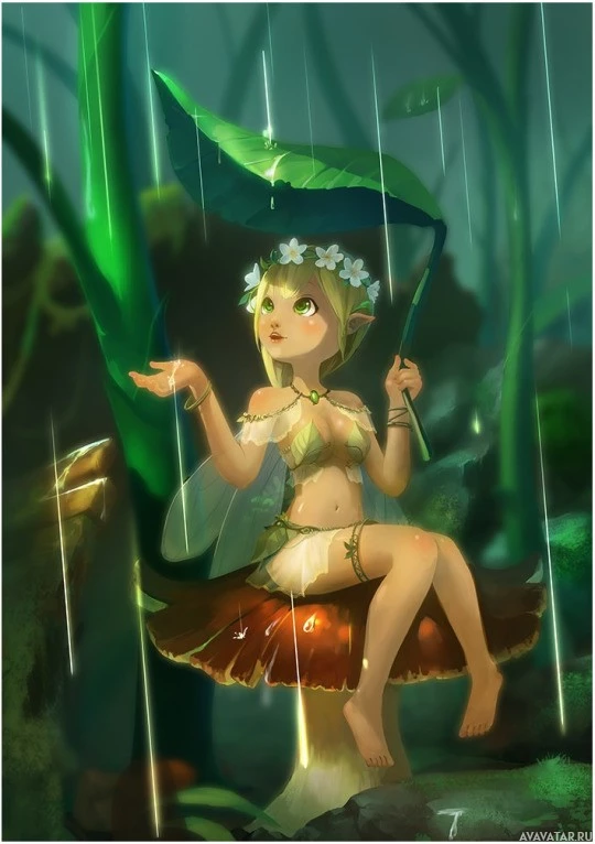 The image shows a fantasy-themed illustration of an elf or fairy sitting in the rain. She is holding an umbrella over her head and has