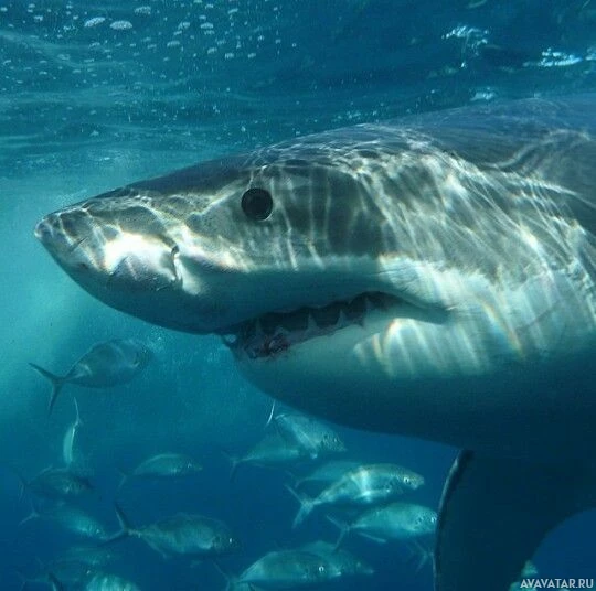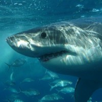 an underwater environment, surrounded by fish. The shark appears to be a great