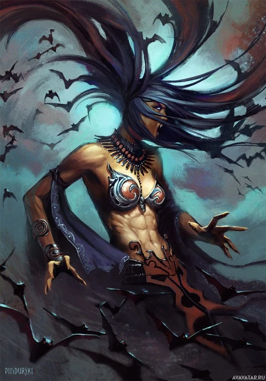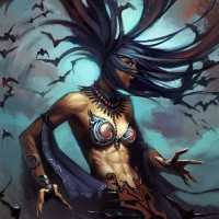 face paint and the gothic attire. The artwork is rich in detail and color, with a strong emphasis on moody lighting that enhances the eerie and mystical mood of the scene.