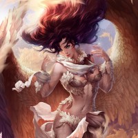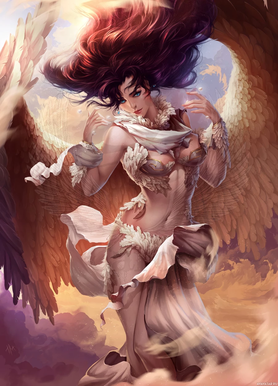 a fantasy character that resembles an angel. She has wings, which are a prominent feature in the illustration. Her attire and posture suggest a sense of elegance and