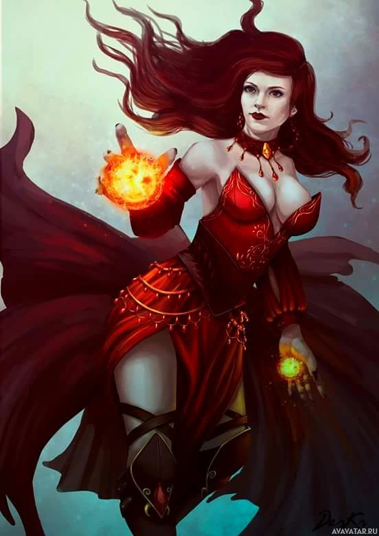 magical powers or abilities related to fire. Her attire resembles that of a sorceress or witch, which is often associated with mysticism and the supernatural in fantasy artwork. The character's
