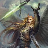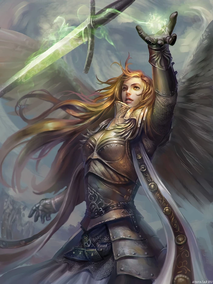 fantasy character, who appears to be a warrior or angel. The character is wearing armor and holding a sword, suggesting they are prepared for battle. They have