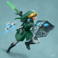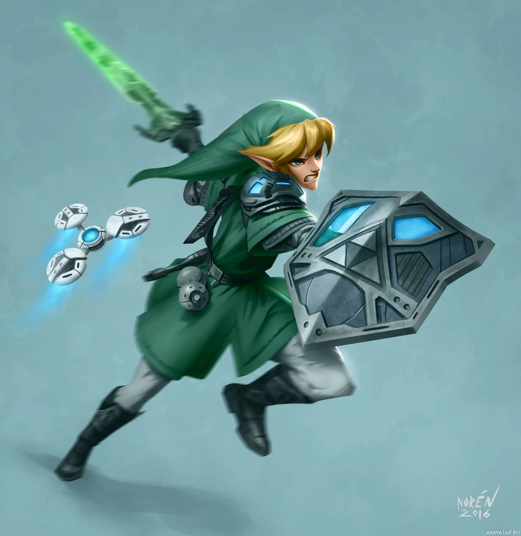 blue lights resembling discs that could be interpreted as a game element or part of an advanced technological device. This character is known as Link from "The Legend of Zelda" series, and it's designed in the style typically associated with the franchise's promotional artwork or merchandise.