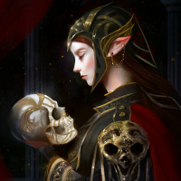 long hair and pointed ears, and is wearing what appears to be armor with intricate designs on it. She is holding a skull in her hand and gazing intently into its