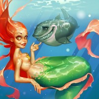 In the image, there is a fantasy illustration of a red-haired mermaid sitting underwater. The mermaid has scales and fins that resemble those of a fish, and she is pointing towards a shark swimming nearby. The setting appears to be a part of an underwater environment where sea creatures can be found.