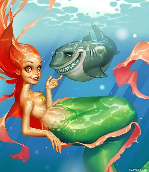 На картинке присутствует фантастическая иллюстрация рыжеволосой русалки, сидящей под водой. Русалка имеет чешуйки и плавники, которые напоминают рыбу, и она указывает на акулу, плавающую поблизости. Это место является частью подводной среды, где можно найти морских существ.