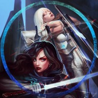 a blonde girl with short hair, dressed in a silver armor and holding a sword. The other character is a brunette girl with